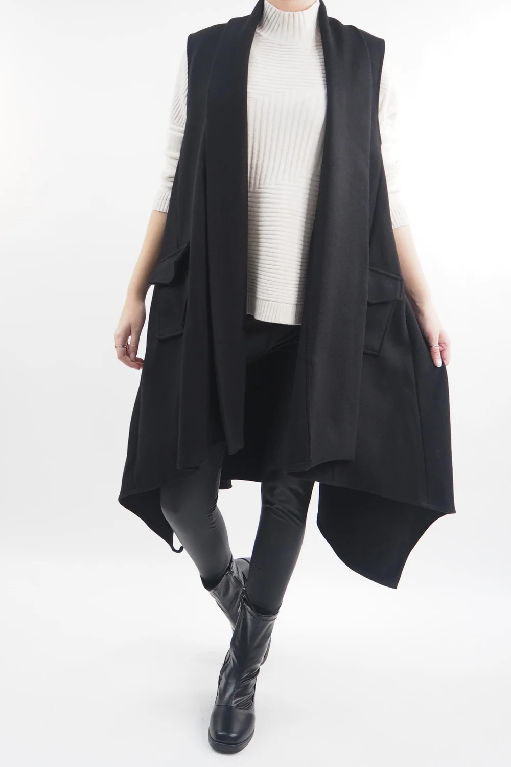 Introducing the epitome of timeless elegance, our Made in Italy Belgravia Weekend Gilet in Black, this classic, longline, trapeze shape gilet is a must-have addition to your wardrobe. Its elongated silhouette not only flatters all body types but also provides ample coverage, making it the perfect choice for layering. Whether you’re aiming for a chic and polished ensemble, styled with our Pesca leather-look leggings or opting for a more relaxed, athleisure-inspired look, this gilet proves its adaptability as a fashion essential.Â