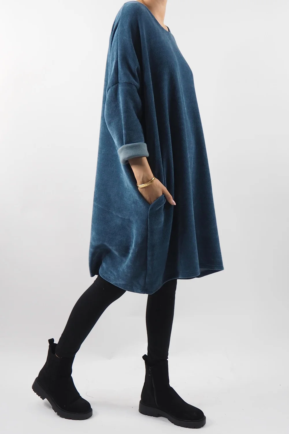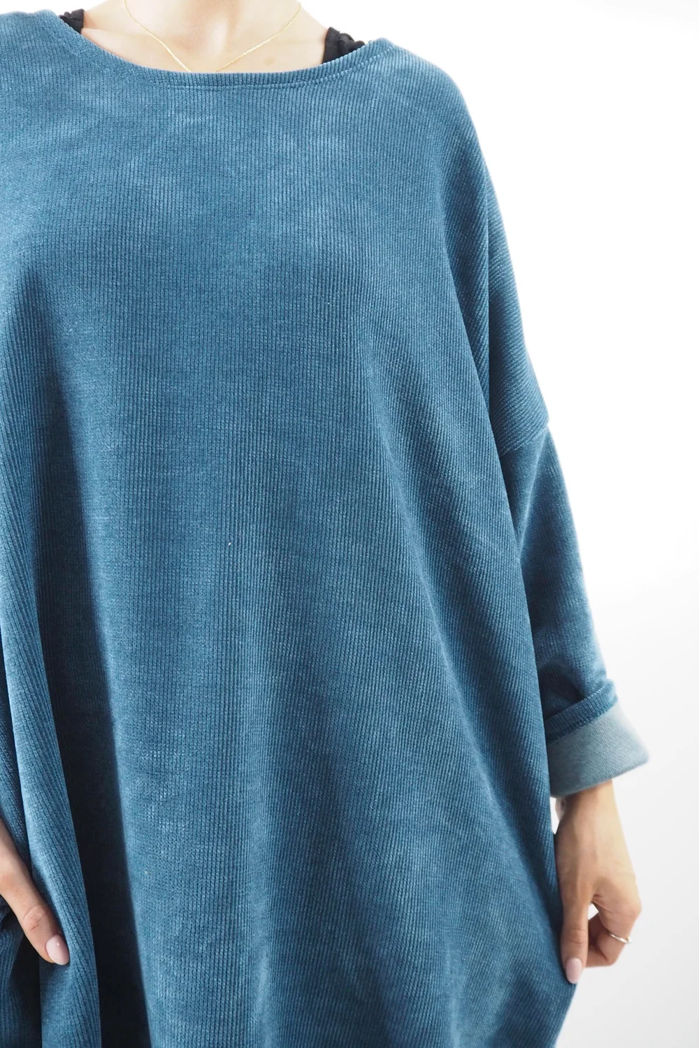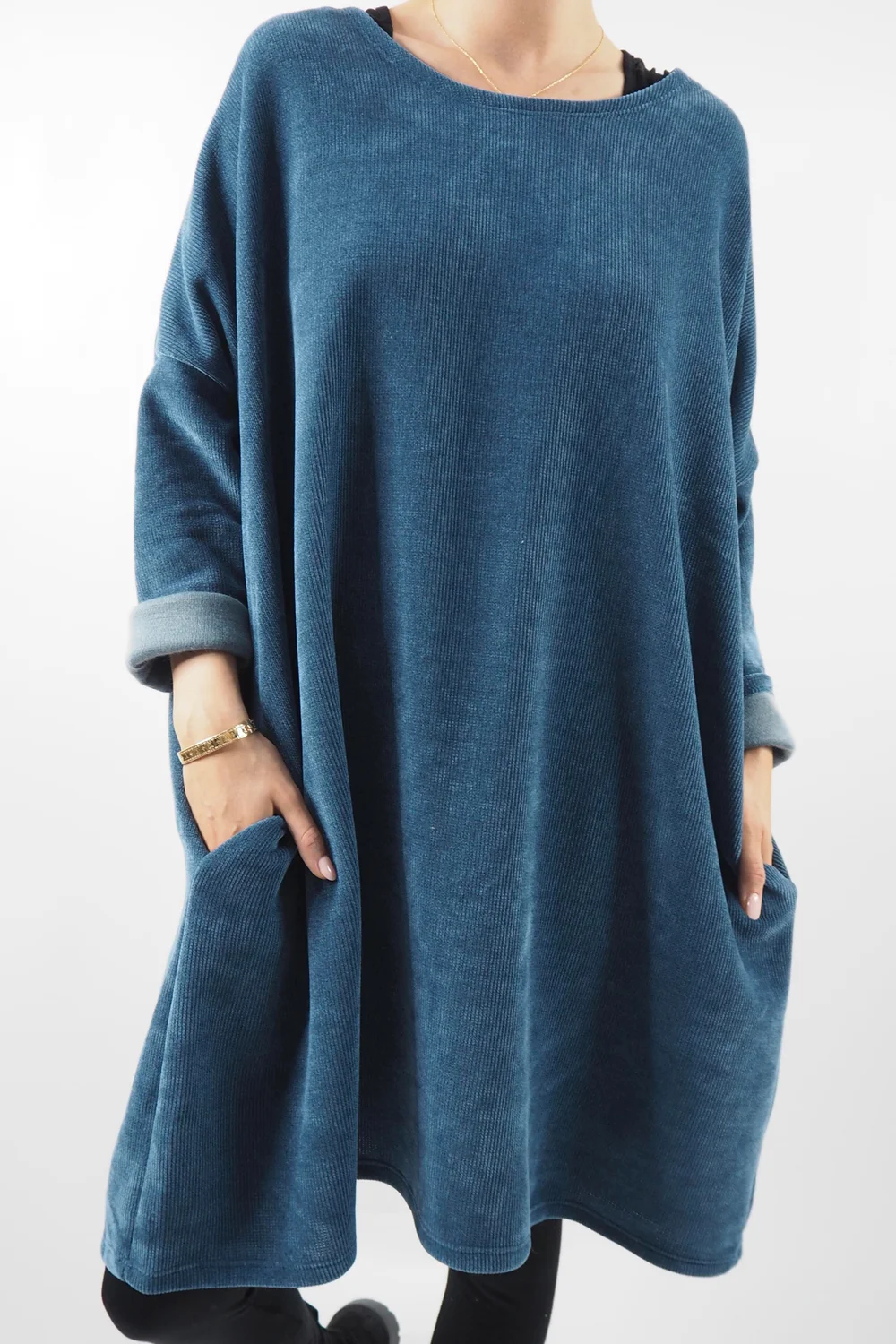 Our Dusk Sac Tunic in Airforce, blue tone, from Made in Italy Clothing: the epitome of everyday comfort and style. Crafted for those who demand both functionality and fashion in their daily attire, this tunic effortlessly marries versatility with a touch of effortless chic. The soft, stretchy needle cord fabric caresses your skin, providing all-day comfort, while the sac shape offers a relaxed and flattering silhouette for all body types. This tunic pairs seamlessly with our Cosy Leg Leggings. Elevate your everyday look with this must-have piece that’s both timeless and trendsetting, a testament to the fusion of comfort and style.
