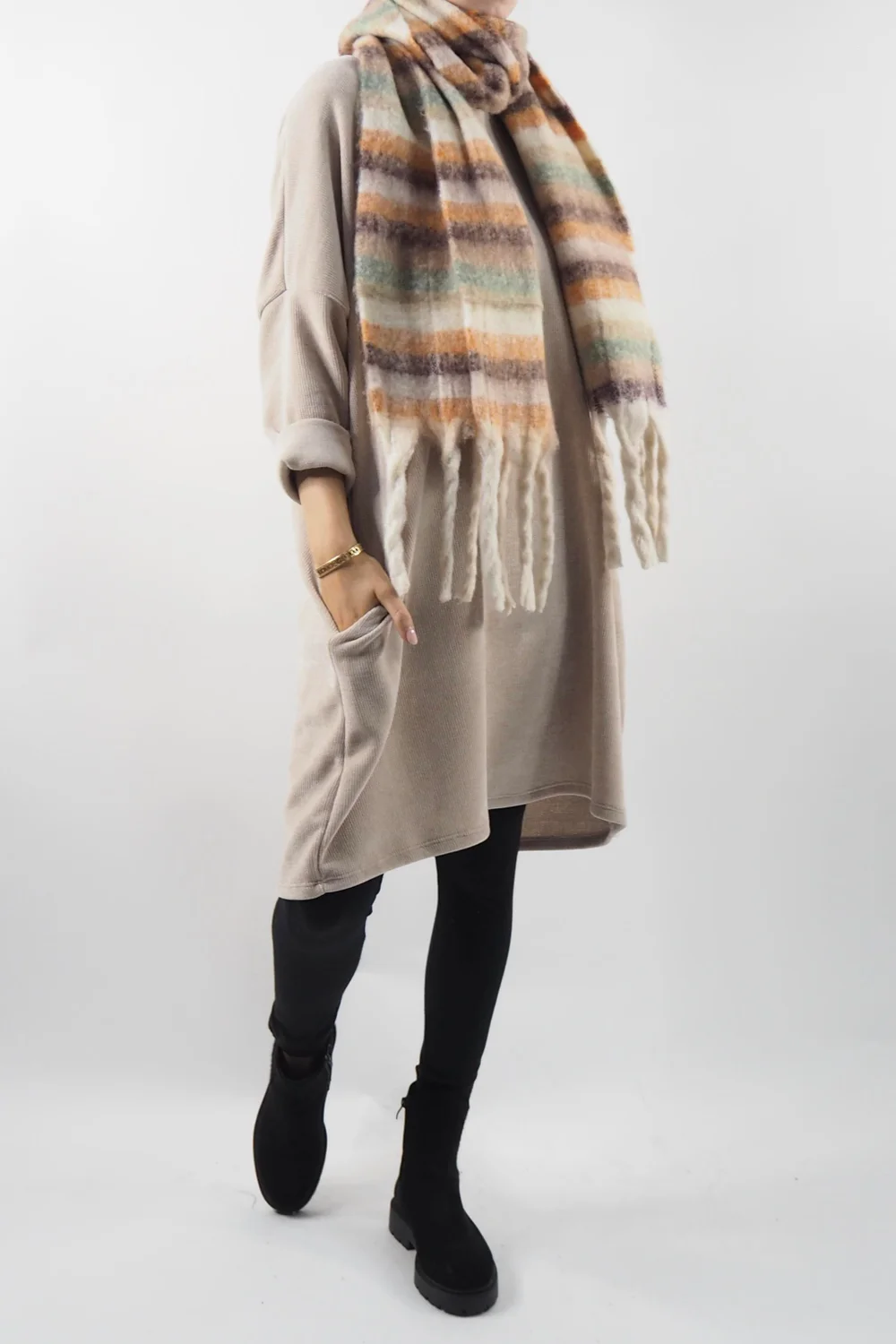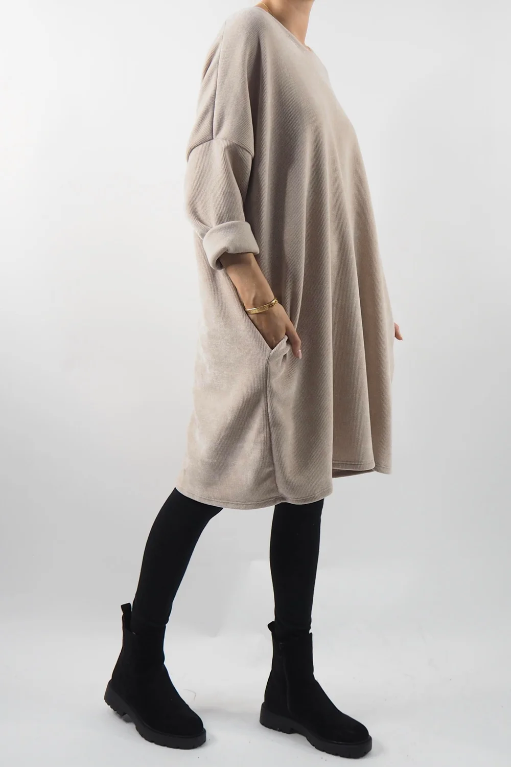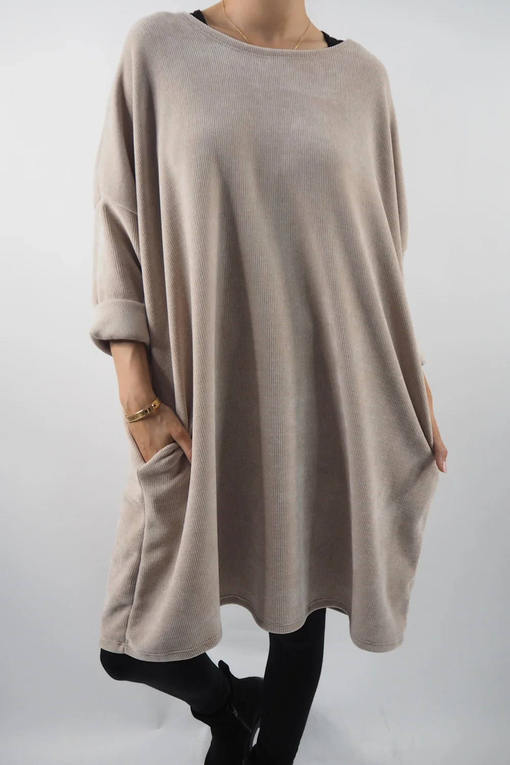 Our Dusk Sac Tunic in Stone, beige tone, from Made in Italy Clothing: the epitome of everyday comfort and style. Crafted for those who demand both functionality and fashion in their daily attire, this tunic effortlessly marries versatility with a touch of effortless chic. The soft, stretchy needle cord fabric caresses your skin, providing all-day comfort, while the sac shape offers a relaxed and flattering silhouette for all body types. This tunic pairs seamlessly with our Cosy Leg Leggings. Elevate your everyday look with this must-have piece that’s both timeless and trendsetting, a testament to the fusion of comfort and style.