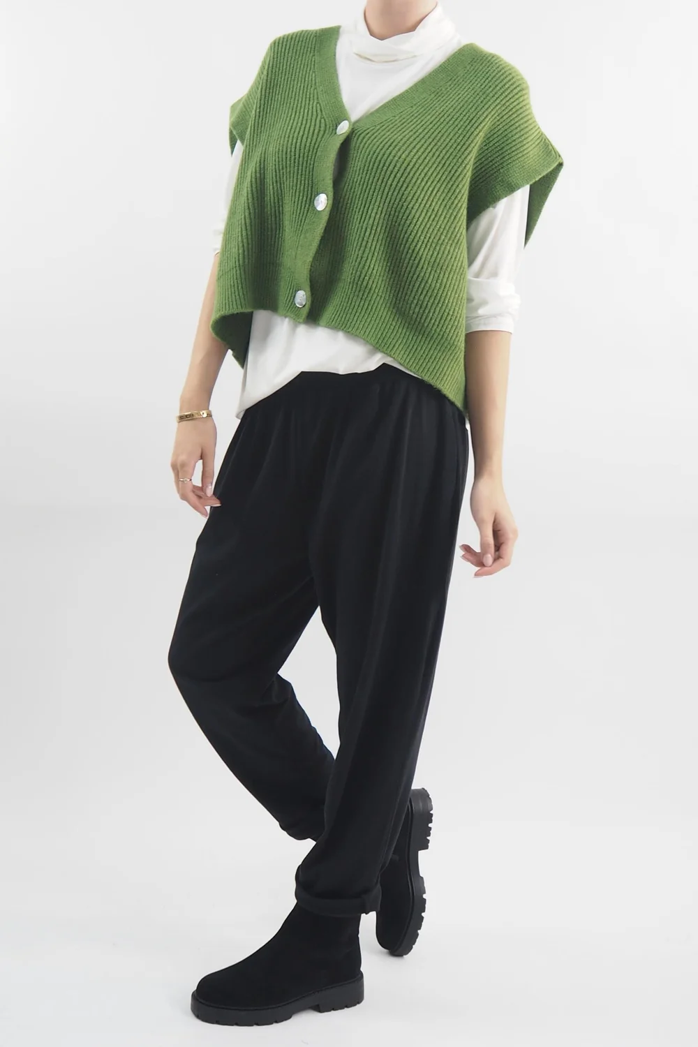 The Made in Italy Halo Half A Cardi in Matcha green tone: Indulge in the exquisite comfort and elegance of our premium quality knit, a stunning fusion of style and warmth reminiscent of a classic half cardigan design. This knit is the quintessential layering piece for the enchanting seasons of autumn and winter. Whether you choose to drape it over our classic Bodhi Archie Dress, creating a whimsical and layered look that’s both chic and cozy, or pair it with a our Fine Jersey Polo Neck and Lagenlook Cocoon Pants, this knit effortlessly channels the sportz luxe aesthetic. Elevate your style and comfort with this versatile and sophisticated knit, designed to keep you snug and stylish all season long.